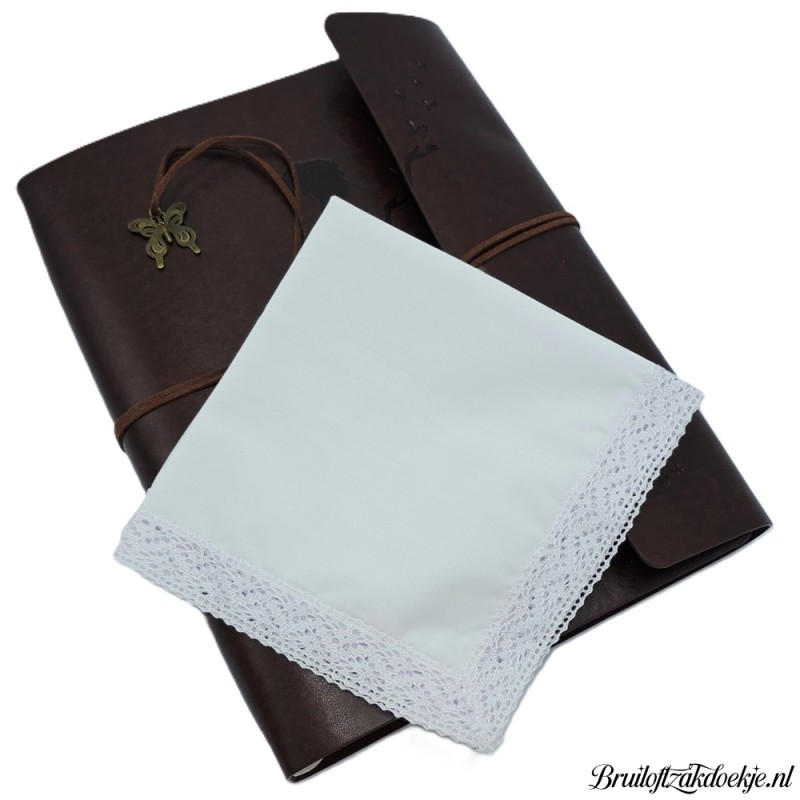 Deze bruidszakdoek is ongeveer 30 x 30 cm met kant.