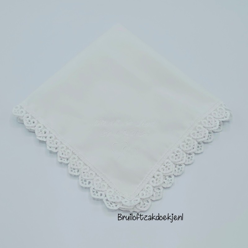 Zakdoek is de kleur ivoor/wit, het kantje is 1,5 cm breed hart vorm.