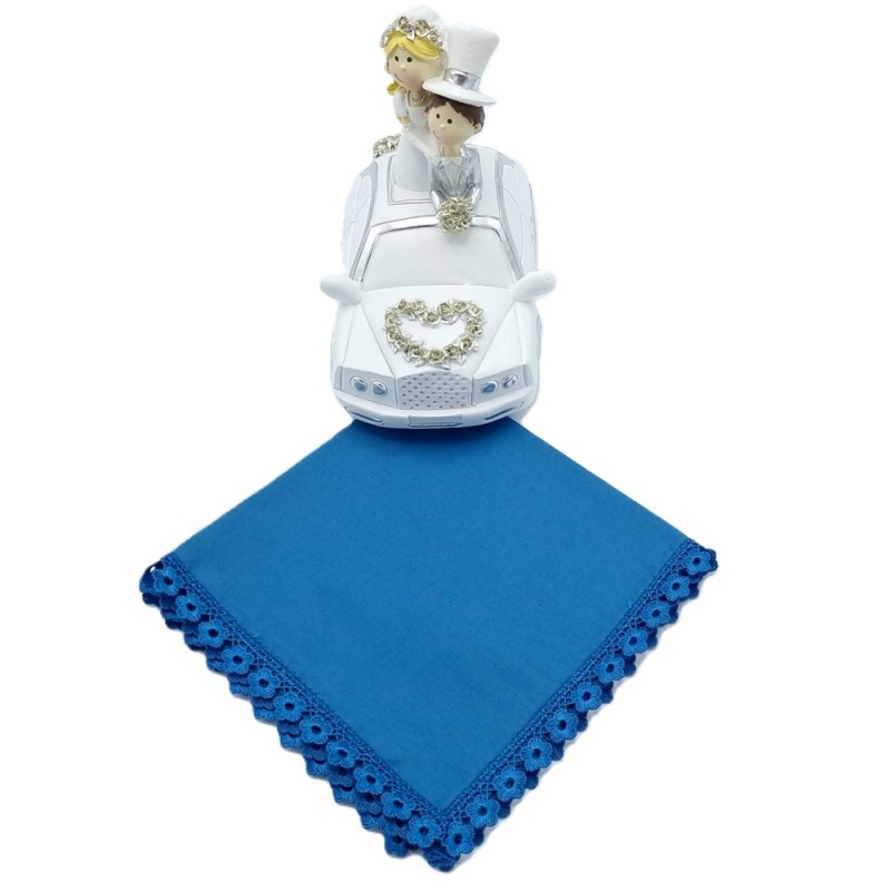 Zakdoek in de kleur donker turquoise, kanten randje is 15 mm breed bloem motief.
