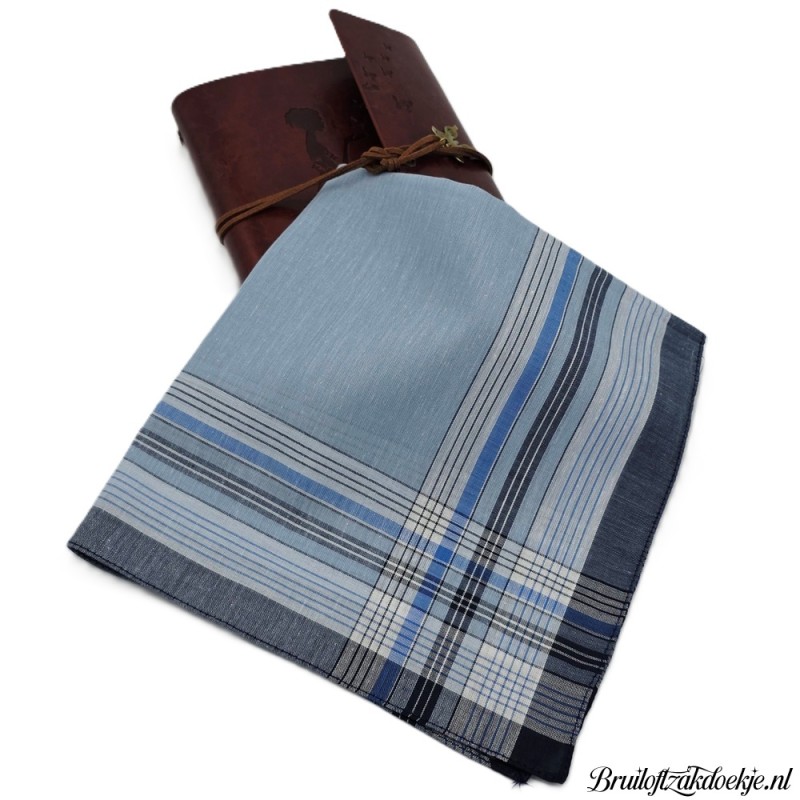 Heren zakdoek saffier met blauw, wit tinten strepen rondom.