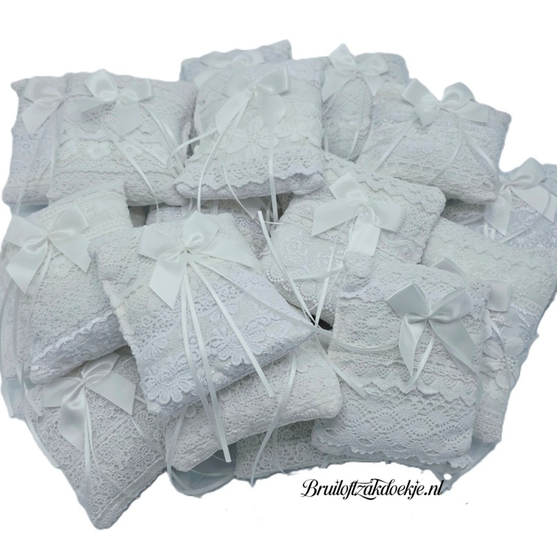 Handgemaakte kussentjes voor trouwringen.