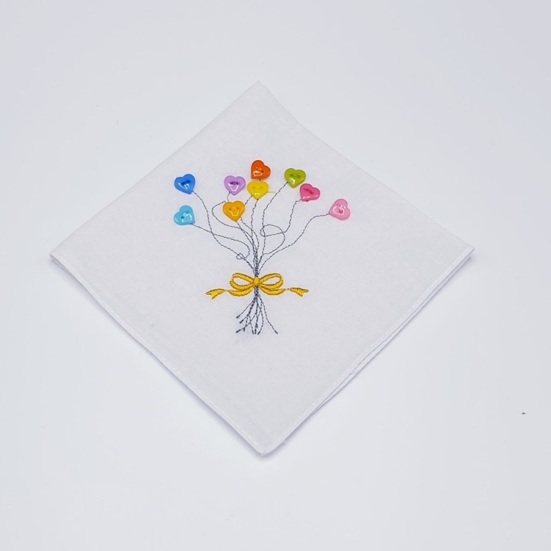 Zakdoek ivoor/wit, met een bos knoop hartjes in verschillenden kleurtjes, strik goud kleur.