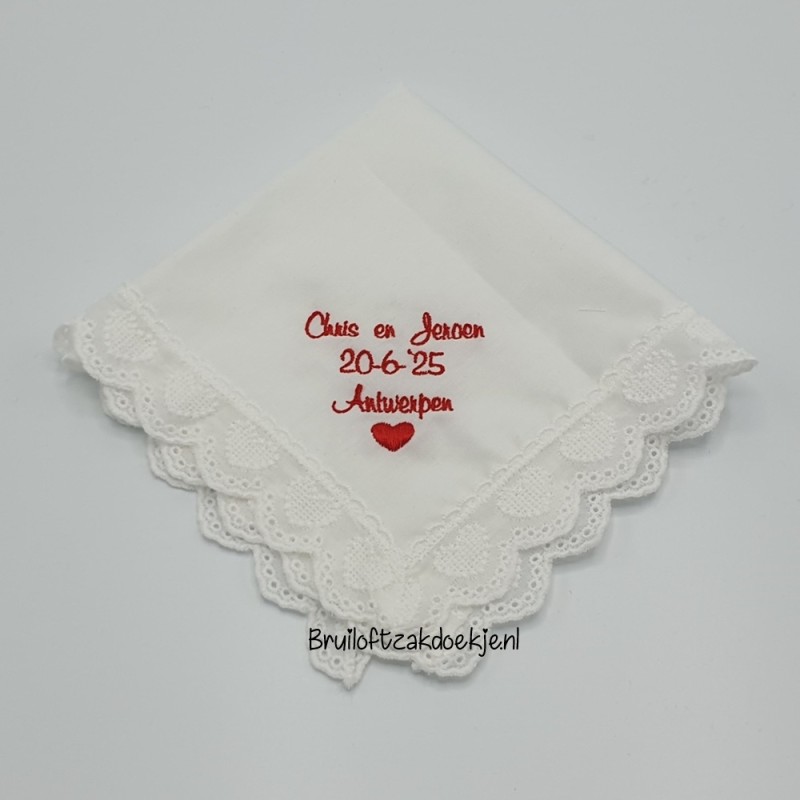 Zakdoek afmeting is ongeveer 30 x 30 cm met kant.