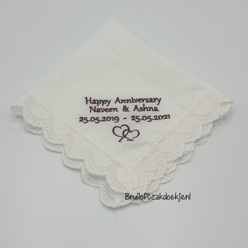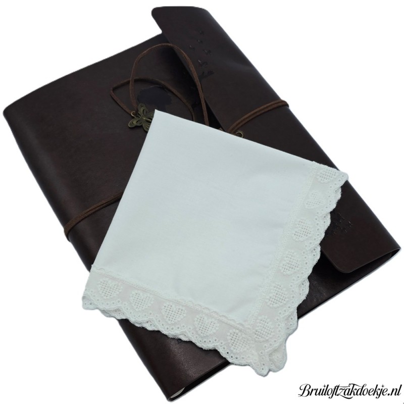 Zakdoek is de kleur ivoor het kantje is 2.5 cm breed hart vorm.