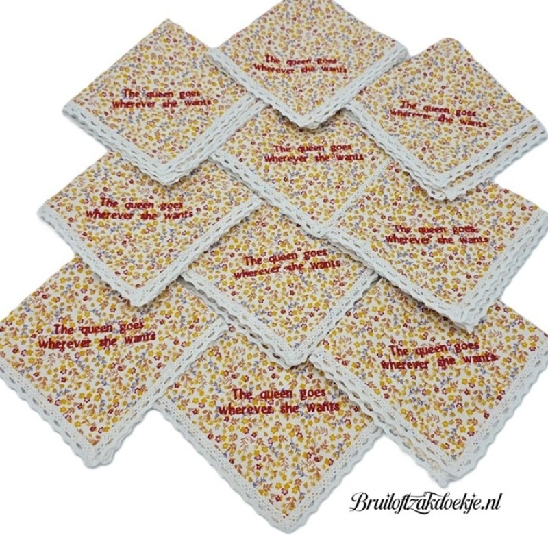Zakdoek met kleine bloemen goud kleur en een witte fijne kanten afwerkrand.