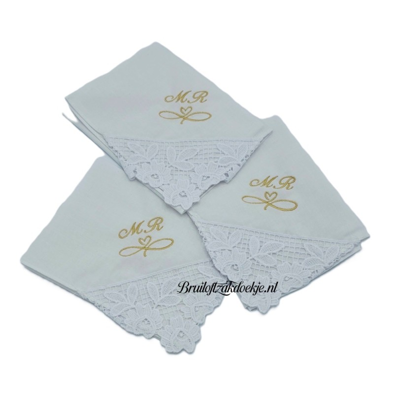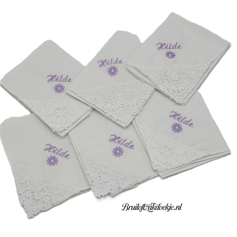 Naam en tekst wordt boven de kanten punt geborduurd.