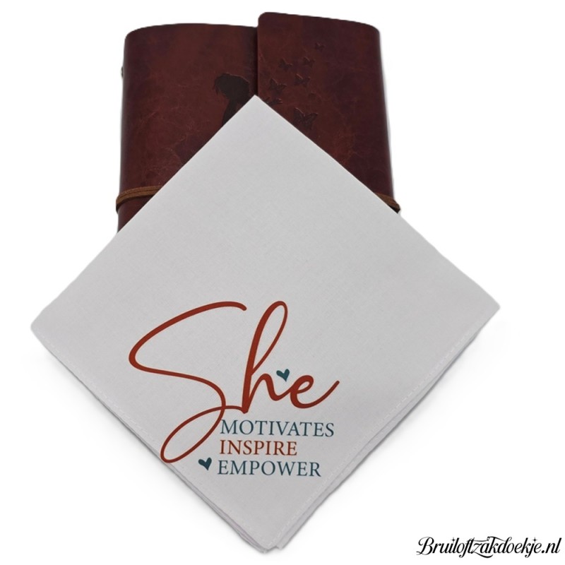 Leuke zakdoek met She motivat inspere empower en power opdruk.