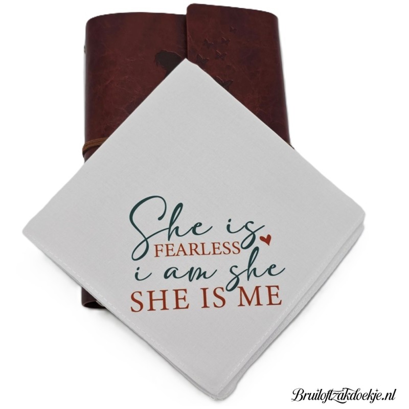 Leuke zakdoek met She is feareless i am she she is me opdruk.