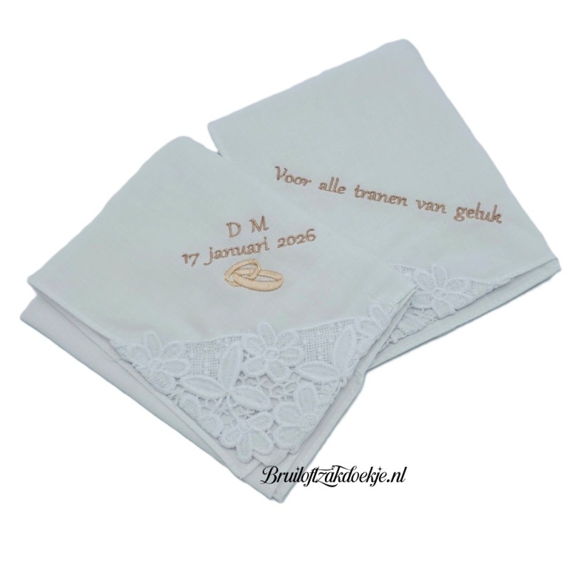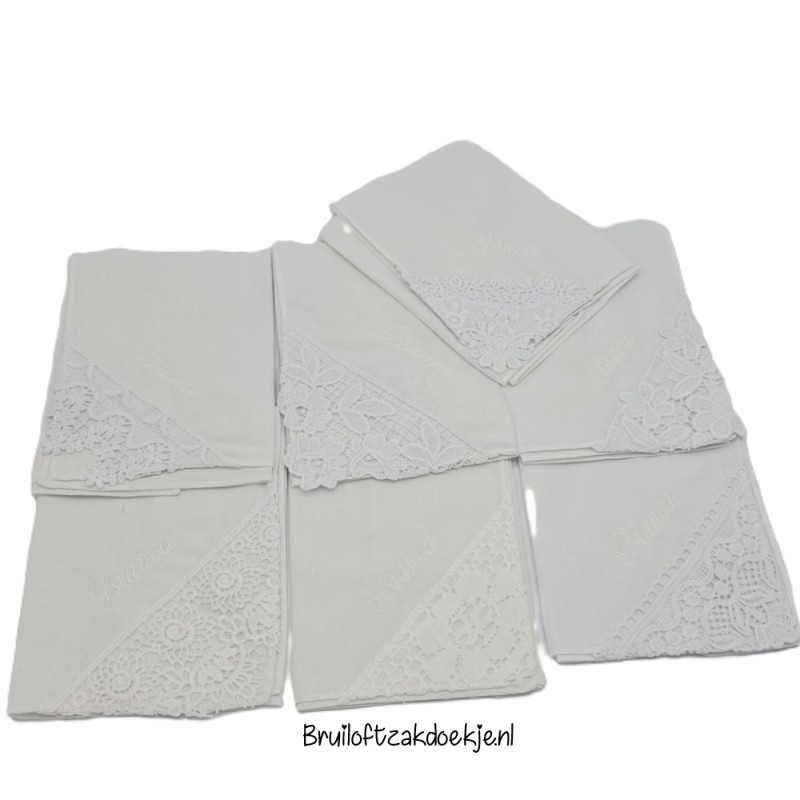 Naam en tekst wordt boven de kanten punt geborduurd.